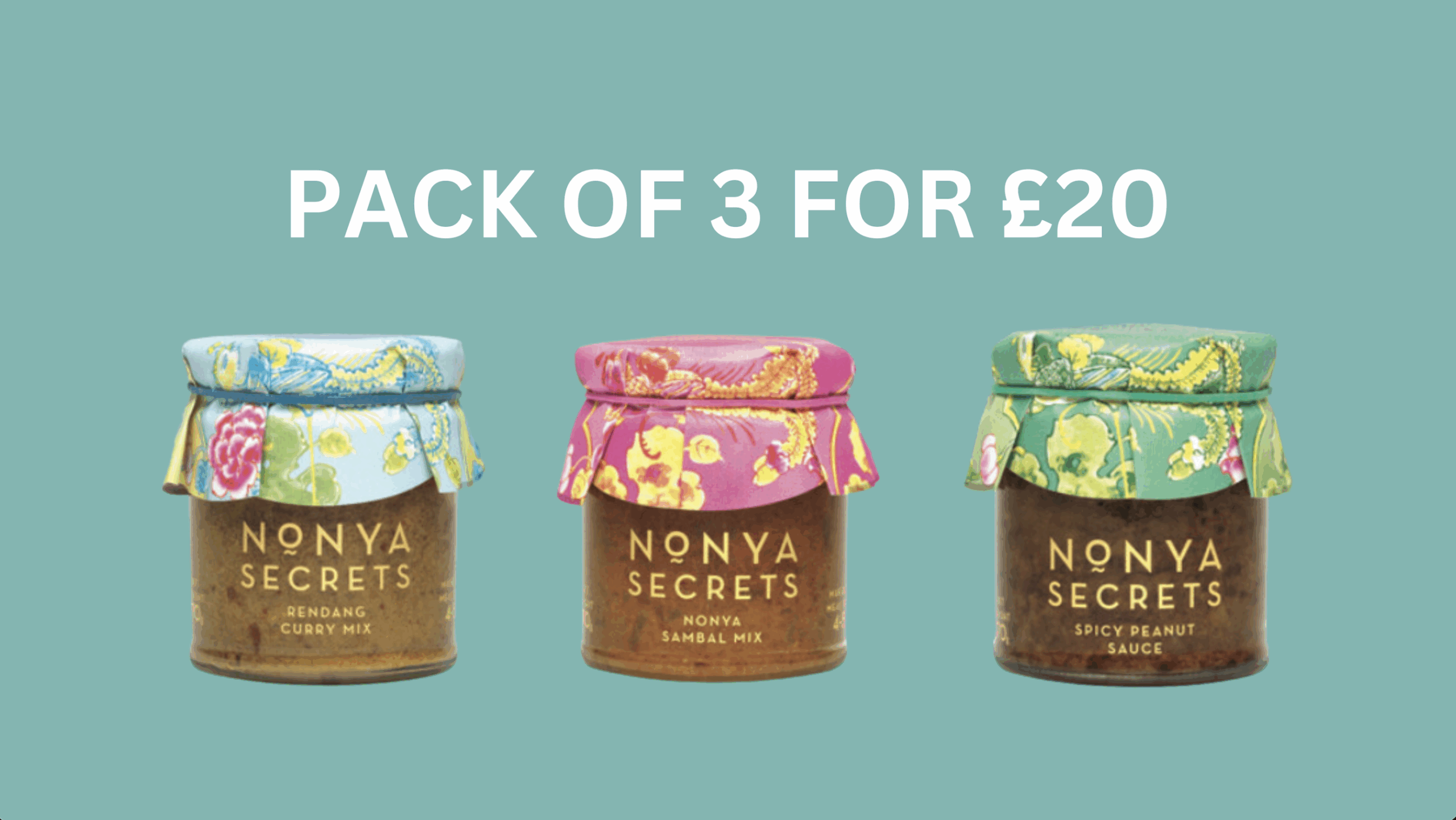 The pack includes Rendang Curry Mix, Nonya Samba Mix & Spicy Peanut Sauce.